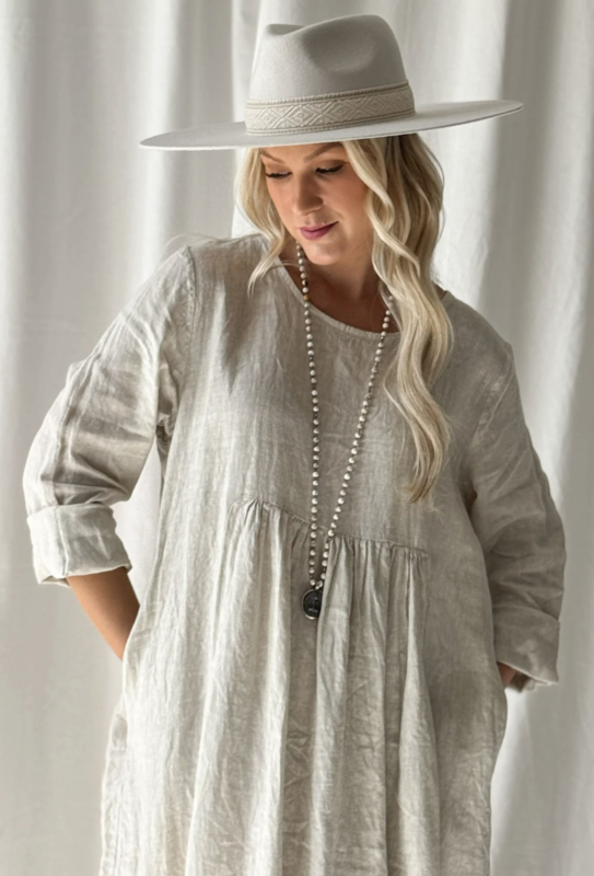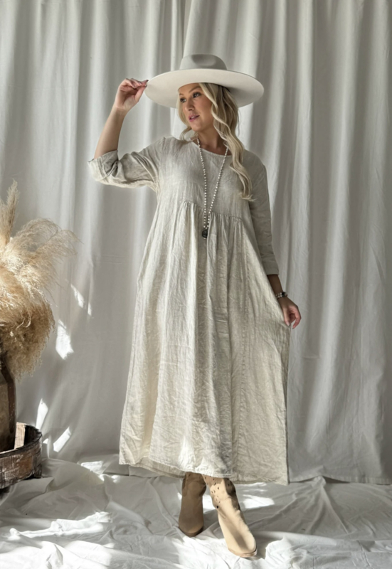 Eerlijk passende, A-lijn linnen jurk met een losse, ronde hals en rechte mouwen. Voor- en achterkant met een mooie kreukel in het midden. Zakken.