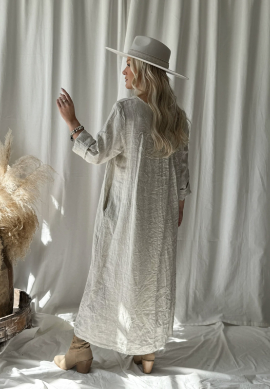 Machinewas op 30 graden, niet in de droger. Wassen met dezelfde kleur. Linnen kan in de was met 2-4% krimpen, maar het vormt zich door gebruik naar je lichaam.