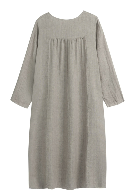 Eerlijk passende, A-lijn linnen jurk met een losse, ronde hals en rechte mouwen. Voor- en achterkant met een mooie kreukel in het midden. Zakken.